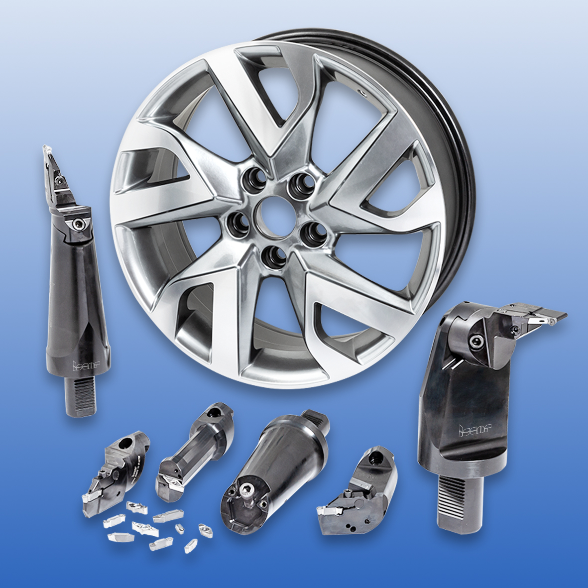 ISCAR developed a system of quick-change assembled tools specifically for turning aluminum wheels. A tool assembly comprises of a cutting head and a holder. The head is mounted on the holder by use of a dovetail connection. The dovetail mechanism assures full-face contact between the holder and the head with very high clamping forces and can resist tough cutting conditions when turning the wheels. The holders are produced with VDI40, VDI50 or round shanks (Fig. 4).
