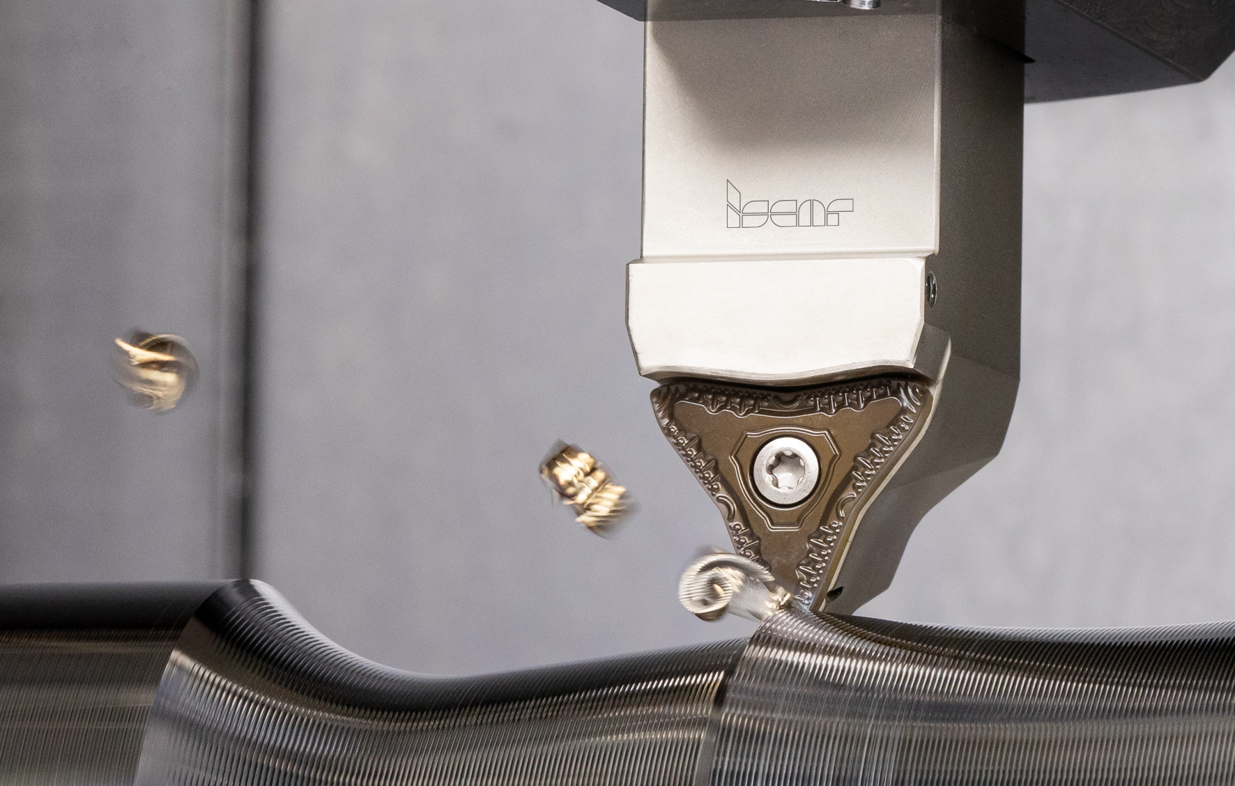 The concave hexagon insert has found further applications in yet another product called the QUICK-T-LOCK tool family, which is also designed for multi-directional turning. Unlike the previously discussed solution based on the negative insert concept, the one-sided Q3-MCMT QUICK-T-LOCK insert (Fig. 3) features a positive structure, with inclined side faces and the bottom of the insert being smaller than the top. Compared to the negative profile of a double-sided insert, the Q3’s configuration provides a more positive cutting geometry, resulting in lighter and smoother cuts. Additionally, the inclined side faces of the Q3 inserts offer better capability for machining hard-to-reach areas. However, the one-sided insert concept yields only three cutting edges which ishalf as many as the Q6. In conclusion, the concave hexagon can be successfully applied to insert designs in tools intended for both heavy roughing and precise light cuts in multi-directional turning.